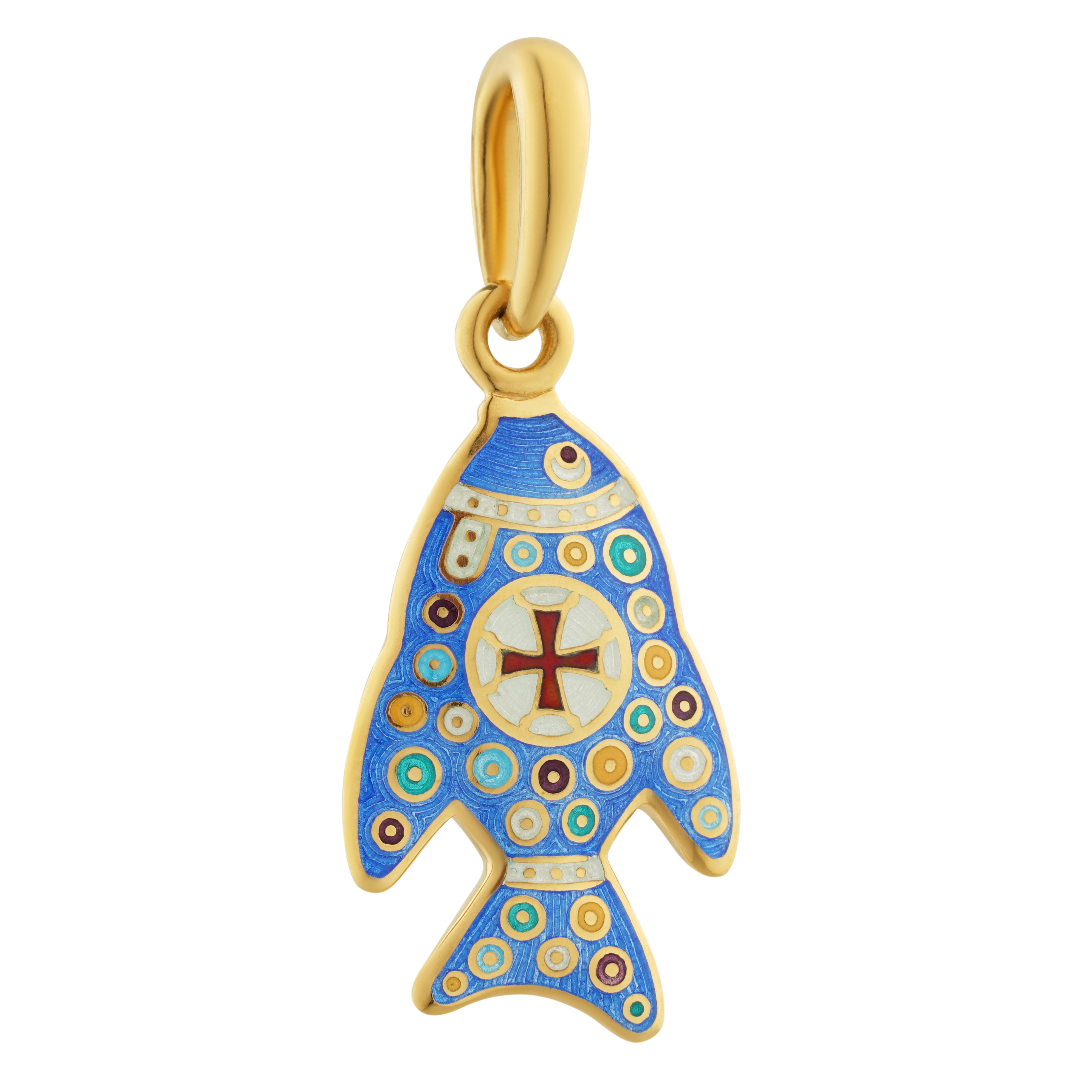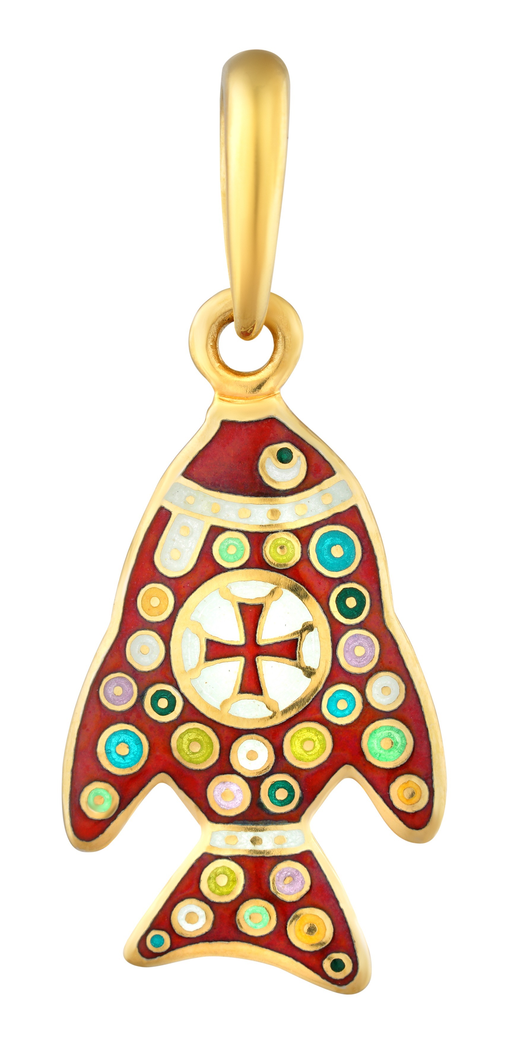 В нашей подвеске вы можете увидеть многие из перечисленных традиций. В центре рыбки изображен круг с четырехконечным крестом – символом Евхаристической Жертвы. Выражая идею света, все свободное пространства тела рыбки мы заполнили разноцветными солярными знаками в виде круга с точкой в центре.