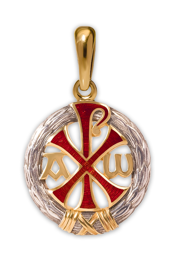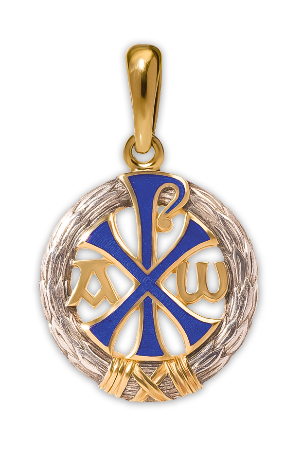 Предлагаемый нагрудный знак представляет собой один из самых древних, а с Константиновских времен и самый распространенный символ Спасителя - монограмму имени Христова, состоящую из двух греческих букв X (хи) и Р (ро). Она традиционно дополнена греческими буквами ɑ (альфа) и ω (омега) и окружена пальмовым венком. Ее называют христограмма, хризм, хризма или хрисм, хрисма.